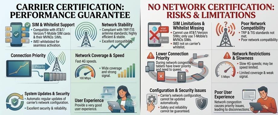 Una tableta resistente certificada se somete a rigurosas pruebas PTCRB para garantizar que funcione perfectamente en las redes de EE. UU. Solo se garantiza que una tableta robusta certificada de AT&T o una tableta robusta de Verizon permanecerá en la 'lista blanca' del operador, proporcionando conectividad 4G/5G estable, actualizaciones automáticas de firmware y acceso prioritario a la red durante la congestión.
